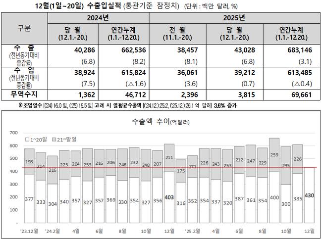 - 12월 1~20일 수출 430억달러…6.8%↑ 무역흑자 38억달러