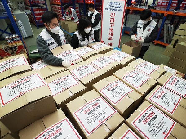 신종 코로나바이러스 감염증 확산이 우려되고 있는 지난 5일 오후 경기도 수원시 대한적십자사 경기도지사에서 직원들이 자가격리자를 위해 즉석밥, 생수, 라면, 통조림 등으로 구성된 긴급구호세트를 제작하고 있다. 이번 긴급구호세트는 경기도 내 자가격리자 증가 우려에 따라 대상자 맞춤 구호품을 사전 준비해 신속히 지원하기 위해 마련됐다. (사진=(c) 연합뉴스)◇ 자가격리자, 독립된 공간에서 혼자 생활
