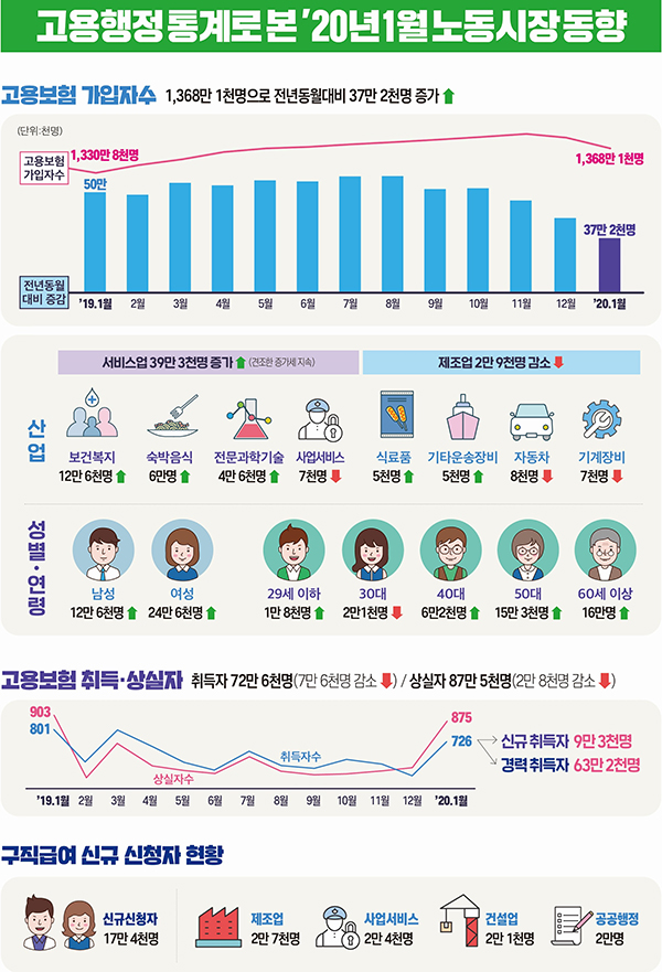 [일간환경연합 신상미 기자]고용노동부가 10일 발표한 ‘고용행정 통계로 본 2020년 1월 노동시장 동향’에 따르면 지난달 고용보험 가입자 수는 지난해 1월 대비 37만 2000명 늘어나 1368만 1000명을 기록했다.