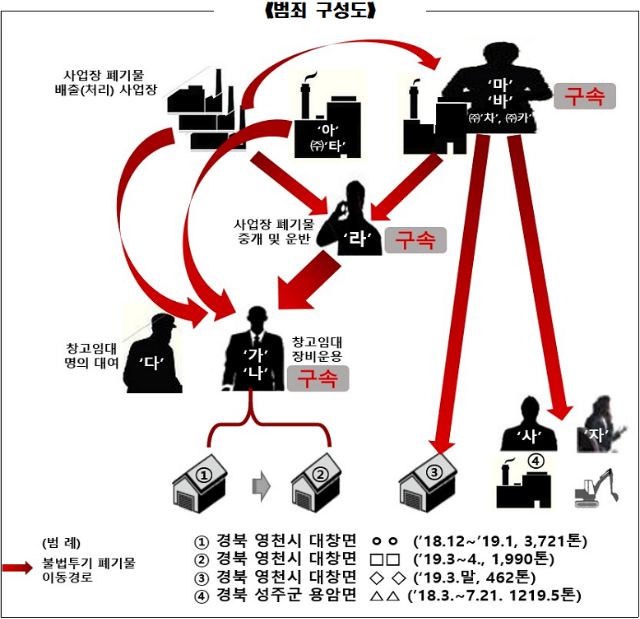 무허가 폐기물처리업자인 '가'는 2018년 12월 24일 경북 영천시 대창면에 다른 사람 이름으로 창고를 빌린 후 폐기물알선책 '라'에게 폐기물과 화물차량의 알선을 요청했다. 폐기물처리업자 '마' 등은 '라'의 알선으로 자신의 사업장과 거래처에서 발생한 폐기물을 '가'에게 반입했다.