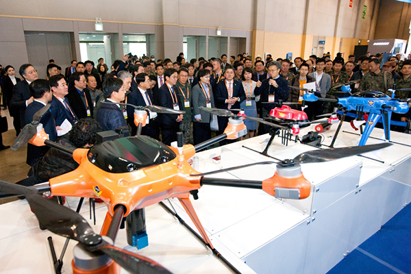 지난해 부산 벡스코에서 열린 ‘2019 드론쇼코리아 개막식’에서 참석자들이 다양한 형태의 드론을 살펴보고 있다.(사진=과학기술정보통신부)개정안에 따르면 드론은 ▲완구용 모형비행장치(250g 이하) ▲저위험 무인비행장치(250g∼7kg) ▲중위험 무인비행장치(7kg∼25kg) ▲고위험 무인비행장치(25kg∼150kg) 등 4단계로 분류된다.