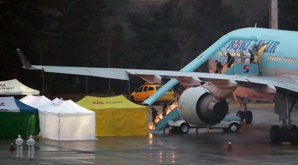 12일 오전 김포공항에서 3차 전세기를 타고 귀국한 중국 우한 교민들이 트랩을 내려오고 있다.(사진=(c) 연합뉴스)외교부는 중국 우한지역에 19일 임시 화물기를 투입해 우리 지자체와 기업, 민간단체에서 지원하는 구호물품을 전달한다고 밝혔다.