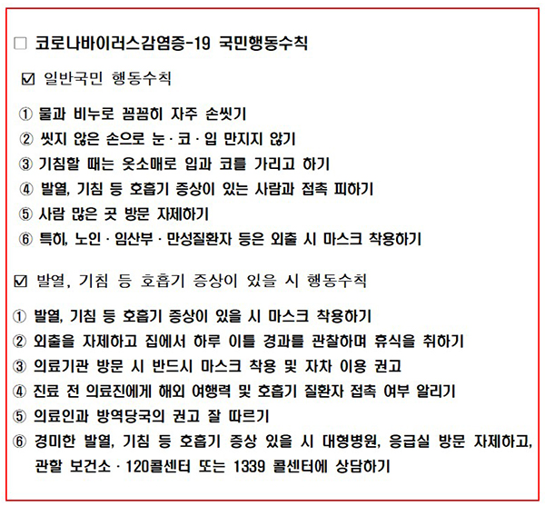 한편 일반 국민들께서는 코로나19 국민행동수칙을 숙지하고, 일상 생활에서 이를 꼭 준수해 줄 것을 거듭 당부했다.