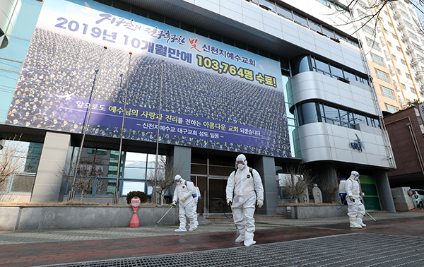 대구시 남구 대명동 신천지 대구교회 인근에서 남구청 보건소 관계자들이 방역하고 있다. (사진=(c) 연합뉴스)중대본은 “전날 국무총리비서실 민정실장을 중심으로 신천지 측과 긴밀한 협의를 한 결과 전체 신도명단 제공, 보건당국의 검사 적극 협조, 교육생의 검진 유도 등 신천지 교회 측의 협조를 이끌어냈다”고 설명했다.
