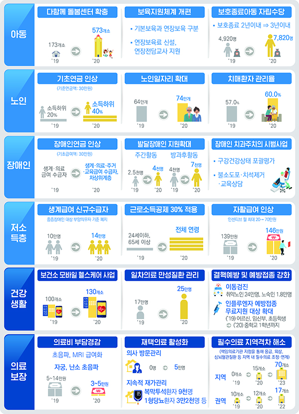 복지부는 2일 ‘국민이 행복한 포용적 복지국가 실현 : 따뜻한 복지, 건강한 미래’를 비전으로 제시하며 ‘저소득층에 대한 소득지원 및 일을 통한 자립지원 확대’ 등의 내용이 담긴 2020년 업무계획을 발표했다.