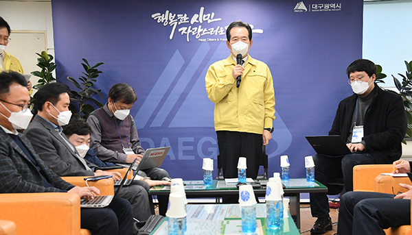 정세균 국무총리가 4일 대구시청에서 열린 기자간담회에서 발언하고 있다.정 총리는 “근본적으로 정부는 공급을 늘려서 국민들의 수요를 다 충족해 주는 노력을 하고 있다”며 “그러나 그것이 부족할 때는 의료진 등 꼭 필요한 사람을 우선으로 공급하되 국민들이 공평하게 느낄 수 있도록 공급 방법을 조정하겠다”고 설명했다.