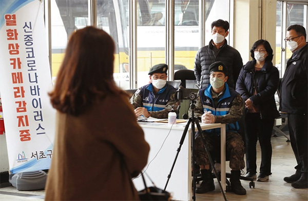 3월 3일 오전 서울 서초구 고속버스터미널에서군 병력과 서초구 직원들이 열화상 카메라로 도착 승객들의 체온을 확인하고 있다.한국 진단검사 능력 세계 최고 수준