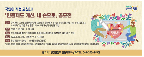 행정안전부는 16일부터 4월 24일까지 40일간 ‘국민이 직접 고친다! 민원제도 개선, 내 손으로’ 공모전을 실시한다고 밝혔다.