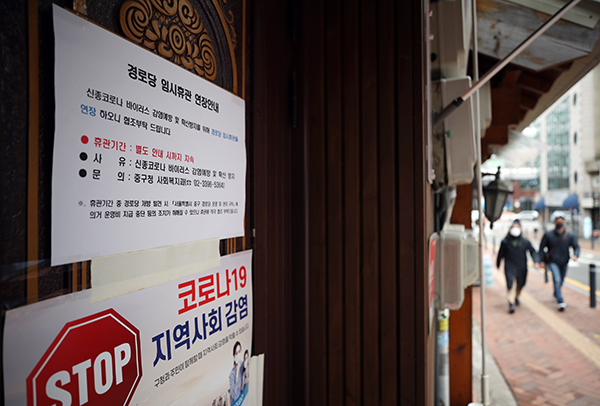 정부가 코로나19 확산을 막기 위해 다음 달 5일까지 지역아동센터와 노인복지관, 경로당 등 이용시설의 휴관을 권고하기로 했다. 사진은 서울 시내 한 경로당에 붙은 임시휴관 연장 안내문. (사진=(c) 연합뉴스)이번 휴관 연장 권고는 집단시설 및 다중이용시설 이용과 종교집회·집단행사 자제 등 ‘사회적 거리 두기’를 통해 코로나19의 지역사회 감염 확산을 차단하기 위한 조치다.