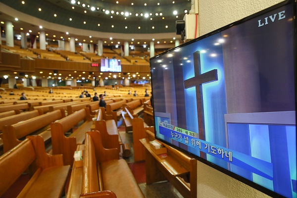 정부가 22일부터 내달 5일까지 종교시설, 실내 체육시설, 유흥시설 등에 대한 운영 중단을 권고했다. 사진은 지난 15일 서울 영등포구 여의도순복음 교회 대성전에서 목회자들만이 드문드문 자리에 앉아 주일 예배를 보고 있는 모습. (사진=(c) 연합뉴스)종교시설의 경우 유증상 종사자는 즉시 퇴근해야 하며, 출입구에서 발열·호흡기 증상 여부 등을 확인해 대장을 작성해야 한다. 종교행사 참여자는 간격을 최소 1~2m 이상 유지해야 하며, 단체 식사 제공이 금지된다.