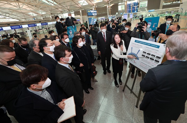 지난 13일 주한외교단 인천공항 방문 모습. 외교부가 초청한 주한 외교사절단이 인천국제공항 제1여객터미널 출·입국 검역 현장을 직접 체험하고 있다.우선 외교부는 주한 외교사절단에 대해 리셉션 등 외교행사 개최를 당분간 자제해 줄 것을 권고하고, 한국에 체류하는 자국민들에게도 주한대사관 홈페이지, SNS 연락망 등을 통해 ‘사회적 거리 두기’에 동참하도록 적극 홍보해 줄 것을 당부할 예정이다.