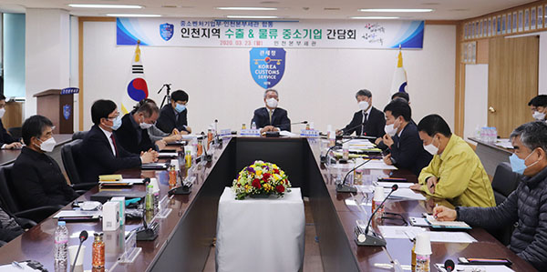 중소기업 옴부즈만과 인천본부세관이 23일 인천본부세관 회의실에서 코로나19 피해를 겪고 있는 인천지역 수출, 물류기업과 간담회를 열고 지원방안을 논의하고 있다.(사진=중소벤처기업부)이날 간담회는 코로나19 영향으로 중국 주요 항만 및 항공노선이 축소돼 어려움을 겪고 있는 수출·물류업계를 돕기 위해 마련됐다.