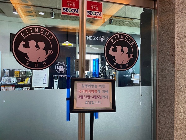 24일 경기도 화성시에 위치한 한 피트니스센터 출입구에 정부 정책에 따라 휴업한다는 안내 문구가 부착돼 있다. (사진=피트니스 209)경기도 안양에서 커피숍을 운영하는 이명선씨는 커피 등 음료수 매장 판매를 포기했다. 커피숍 안 작은 테이블에 앉아 대화하다가 침이 테이블에 튀고, 그 테이블을 댔던 손으로 얼굴을 만지면 바이러스가 침투할 수 있다는 전문가의 조언 때문이었다.