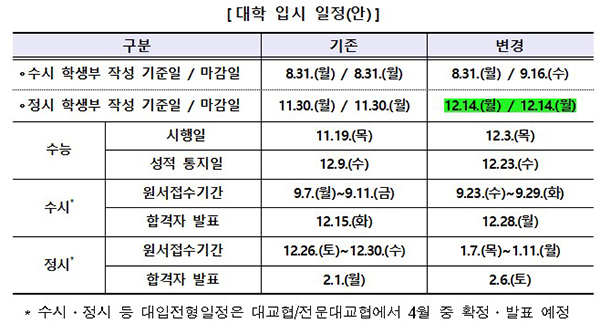 정시 원서접수 기간도 내년 1월 7∼11일로 2주가량 연기되고 합격자 발표일은 2월 6일로 예정됐다.