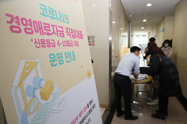 3월 31일 서울 영등포구 영등포로 소상공인진흥공단 서울서부센터에서 소상공인들이 코로나19 경영애로 자금 대출신청에 대해 상담받고 있다. (사진=(c) 연합뉴스)총 12조 규모의 초저금리 금융지원 패키지를 비롯해 회사채 시장 안정화 프로그램 등을 어디서 어떻게 신청하고 이용할 수 있는지 살펴봤다.