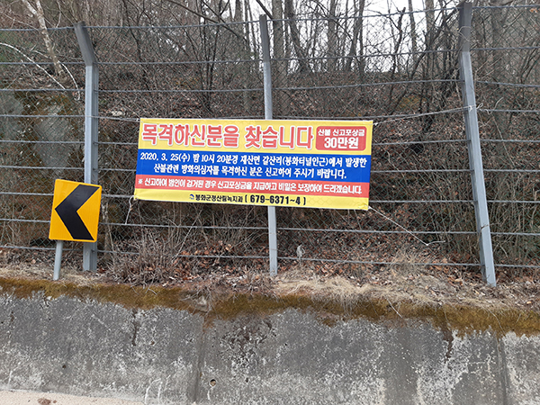 야간산불 방화의심자 신고 현수막(사진=산림청).이와 관련, 산림청은 대형산불 발생 우려가 큰 청명·한식을 전후해 전국에 산불방지 특별경계령을 내리고 산불 가해자 검거 활동을 강화하고 있다고 밝혔다.