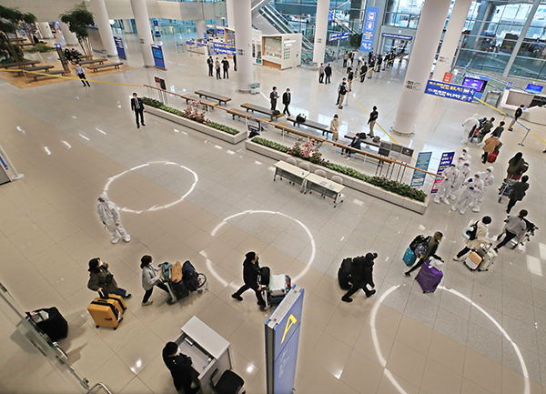 인천국제공항을 통해 귀국한 해외입국자들이 줄지어 진단검사를 받으러 이동하고 있다.(사진=(c) 연합뉴스)윤태호 중앙사고수습본부 방역총괄반장은 5일 정부세종청사에서 열린 정례브리핑에서 “지난 1일 전 세계 입국자를 대상으로 의무적인 격리가 확대됐고 해외유입 차단을 위해 자가격리에 대한 관리가 무엇보다 중요해졌다”며 이 같이 밝혔다.