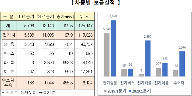 올해 1분기 동안 전기차는 1만 1,096대가 보급되어 97.9% 증가했으며, 특히 전기화물차의 보급이 3대에서 2,890대로 크게 늘어났다.