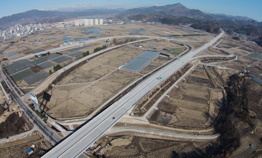 | 광주와 대구를 잇는 광주대구고속도로(옛 88올림픽고속도로) 4차로 확장 공사가 완료된 거창군 거창IC 부근을 차들이 시원하게 달리고 있다. |