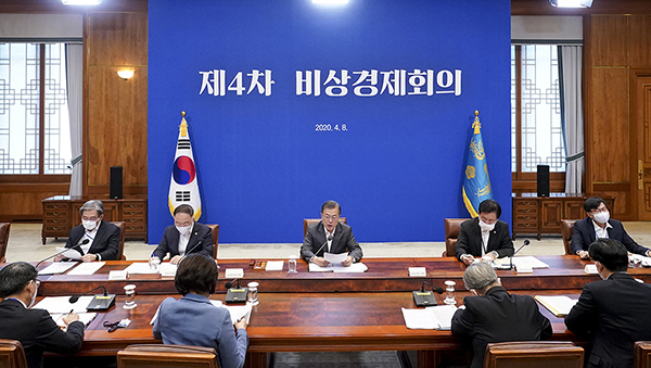 문재인 대통령이 8일 청와대에서 열린 코로나19 대응 관련 제4차 비상경제회의를 주재하고 있다. (사진=청와대)문 대통령은 이날 청와대에서 주재한 4차 비상경제회의에서 “정부는 100조원 규모의 비상금융조치를 단행해 기업 지원에 나섰고, 긴급재난지원금을 국민에게 지급하는 초유의 결정도 했다. 하지만 아직 충분하지 않다”며 이 같은 대책을 발표했다.