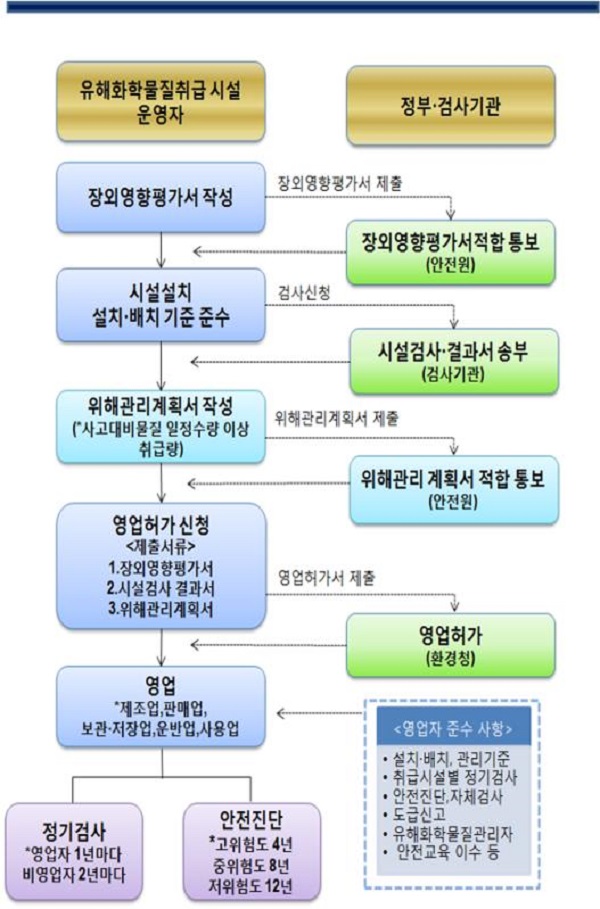 유해화학물질 취급시설은 ‘화학물질관리법’에 따라 장외영향평가서를 작성해 적합판정을 받아야 하며, 취급시설의 안전관리기준 준수 여부를 검사받은 후 최종적으로 허가를 받을 수 있다. 모든 절차를 완료하는 데에는 통상적으로 최대 75일이 소요된다.