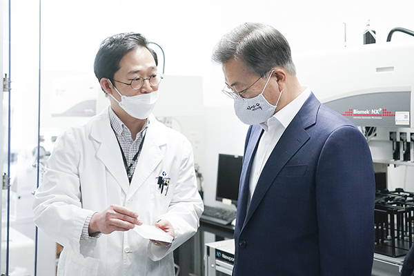 문재인 대통령이 지난 9일 오전 경기도 성남시 한국파스퇴르연구소에서 열린 코로나19 치료제·백신 개발 산업계·학계·연구소·의료계 합동 회의에 앞서 연구시설에서 화합물 처리 과정에 대한 설명을 듣고 있다. (사진=청와대)이어 “지원단은 코로나19 국산 치료제 및 백신 개발 상황을 종합 점검하고, 신속한 의사결정 체계를 마련해 규제 등 현장 애로사항을 신속하게 발굴·해소할 것”이라고 덧붙였다.
