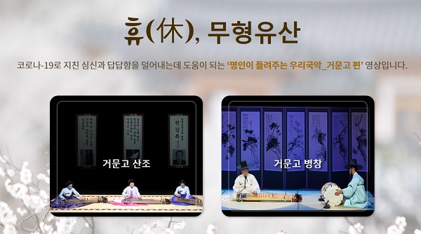 문화재청 국립무형유산원은 코로나19로 사회적 거리두기 기간이 연장됨에 따라 국립무형유산원 누리집(www.nihc.go.kr)에 ‘휴(休), 무형유산’을 개설해 13일부터 6월 22일까지 개시한다고 밝혔다.