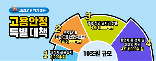 취업에 어려움을 겪는 청년 등을 위해 55만명 규모의 공공 및 청년 일자리를 창출하고, 고용보험의 사각지대에 있는 취약계층에는 1인당 월 50만원씩 3개월 동안 지원금을 지급한다.