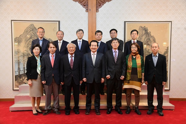 정세균 국무총리가 23일 오후 서울 삼청동 총리공관에서 열린 코로나 이후 새로운 일상을 위한 목요대화에 참석한 각계 석학·전문가들과 기념촬영 하고 있다.정 총리는 이 자리에서 “용기와 희망을 가지고 코로나19가 가져올 변화에 적극적이고 선제적으로 대응해 한 단계 더 도약하는 대한민국에서 새로운 일상을 맞이할 수 있도록 준비를 해야 할 때”라고 밝혔다.