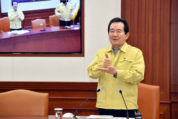 정세균 국무총리가 26일 정부서울청사에서 열린 코로나19 중앙재난안전대책본부 회의를 주재한 자리에서 코로나19로 고생하는 의료진께 존경을 뜻하는 수어로 감사의 뜻을 전하고 있다.정 총리는 이날 정부서울청사에서 열린 코로나19 중앙재난안전대책본부(중대본) 회의를 주재한 자리에서 “일상과 방역을 병행하는데 필요한 규범은 아직 제대로 확립한 나라가 없다”면서 “우리가 만들고 성공적으로 정착시킨다면 다른 나라의 벤치마킹 대상이 될 것”이라고 말했다.