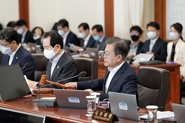 문재인 대통령이 28일 오전 청와대에서 국무회의를 주재하고 있다. (사진=청와대)이번 개정안은 지난 8일 대통령 주재 제4차 비상경제회의에서 발표한 ‘선결제·선구매 등을 통한 내수 보완방안’의 후속조치로 내달 1일부터 시행된다.