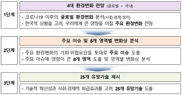 유망기술 분석 절차는 ▲환경변화 전망 ▲영향을 많이 받는 영역별 변화상 분석 ▲유망기술 도출 등 크게 3단계를 거쳤다.