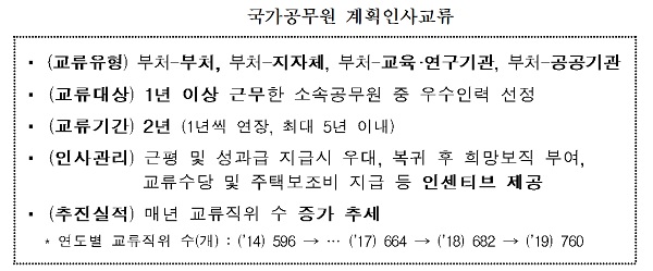 이번 혁신 방안은 문재인 정부 출범 이후 시행된 공공기관 인력확충이 조직의 성과향상으로 이어질 수 있도록 하기 위한 것으로, 공공기관 간 인사교류제도 도입·특별승진제도 시행, 개방형 계약직제 강화 등이 핵심이다.