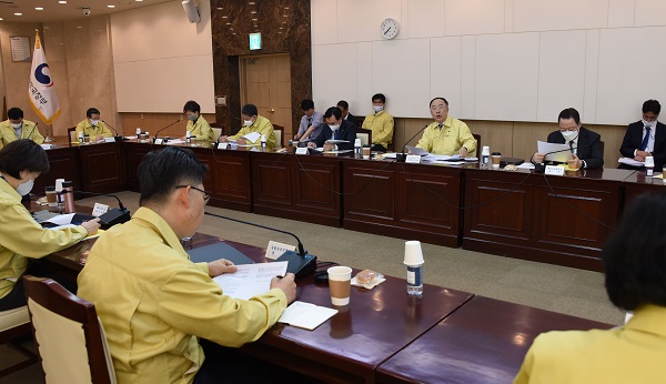 홍남기 부총리 겸 기획재정부 장관이 29일 광화문 정부서울청사에서 열린 ‘제1차 비상경제 중앙대책본부 회의’를 주재, 모두발언을 하고 있다.이번 혁신방안은 오프라인·대면관계를 기초로 설계된 기존 규제체제를 코로나19를 계기로 가속화될 ‘디지털경제’와 ‘비대면 경제’ 중심으로 유연하게 재설계할 필요성이 높아지면서 10대 산업분야 규제 혁신에 나선 것이다.