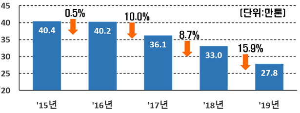 - 2019년도 총 배출량 27만7,696톤, 전년 대비 5만 2,350톤 감소
