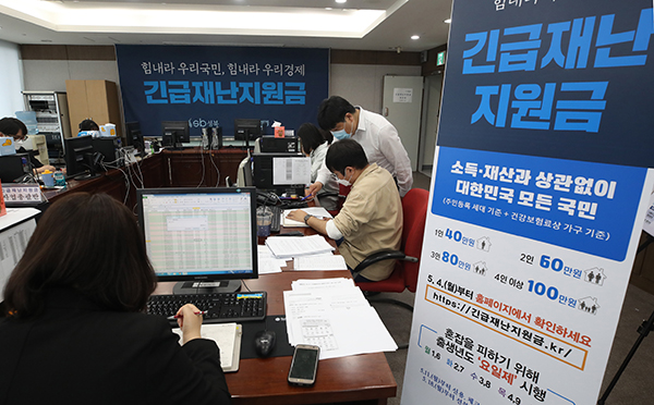 12일 서울 성북구청에서 직원들이 긴급재난지원금 신청과 관련해 안내, 상담을 하고 있다. (사진=(c) 연합뉴스)또한, 가맹점이 긴급재난지원금 사용 시 결제를 거절하거나 불리하게 대우할 경우 관련 법률에 의거해 처벌할 수 있다.