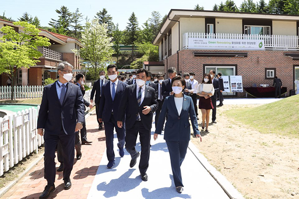 김현미 국토교통부 장관은 13일 그린리모델링 우수사례인 한국수자원공사의 ‘물사랑 어린이집’을 찾아 에너지 성능과 공기질 개선 등 그린리모델링 사업 도입에 따른 효과를 확인하고 각계 전문가들과 함께 활성화 방안을 논의했다.