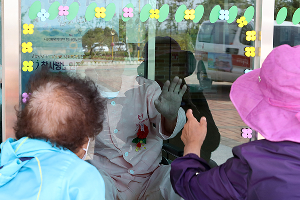 지난 8일 어버이날 오전 전남 무안군 현경면 한 요양병원에서 면회객이 유리문을 사이에 두고 입원환자인 가족과 대화하고 있다. 이 요양병원은 코로나19 예방을 위해 ‘비접촉 창문 면회’를 시행하고 있다. (사진=(c) 연합뉴스)정부는 그동안 고위험 집단시설의 적극적인 감염예방과 확산 방지를 위해 요양병원·정신병원·요양시설에서 입소자 건강상태를 매일 모니터링하고 지자체와 함께 비상대응체계를 구축해 왔다.