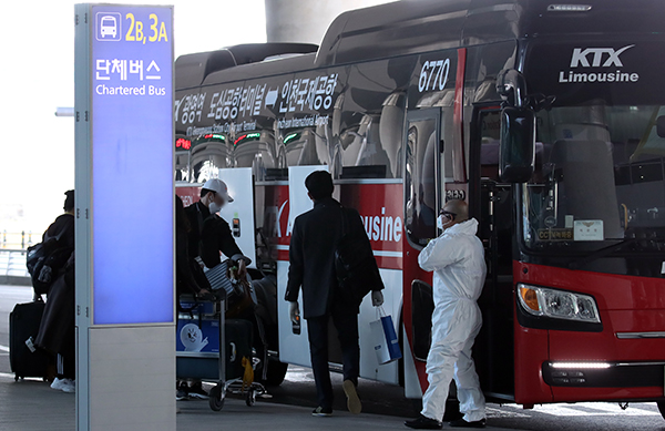 인천국제공항 2터미널에서 유럽발 무증상 입국자들이 KTX 광명역으로 향하는 버스에 탑승하고 있다. 코레일은 코로나19 확산방지를 위해 지난 3월 28일부터 해외입국자 전용 KTX 칸과 공항버스 운행을 시작했다. (사진=(c) 연합뉴스)그동안 각 지자체에서는 해외 입국자가 자가격리 장소로 이동하는 과정에서 대중교통으로 감염병을 전파할 우려가 없도록 담당인력을 인천국제공항과 KTX 광명역으로 파견해 해외입국자의 교통지원을 해 왔다.