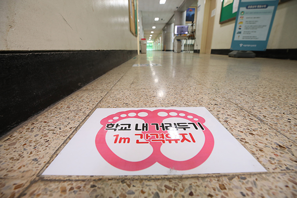 20일부터 시작하는 고등학교 3학년 학생들의 등교 수업 시작을 앞두고 서울 용산고등학교 중앙 현관 발열 측정소에 안전거리 안내 발판이 바닥에 설치되어 있다. (사진=(c) 연합뉴스)권 부본부장은 “(학교는)교내에 집단감염을 차단하는 사전스크리닝 제도를 실시하고, 학교별로 최선을 다해서 감염예방 노력을 해왔다”고 설명했다.