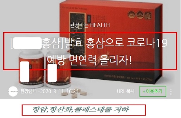 [일간환경연합 한선미 기자]홍삼과 비타민 등이 코로나19 예방과 치료효과가 있는 것처럼 온라인에서 허위·과대 광고한 사례가 972건 적발됐다. 해당 판매 사이트는 차단 및 삭제 조치됐다.