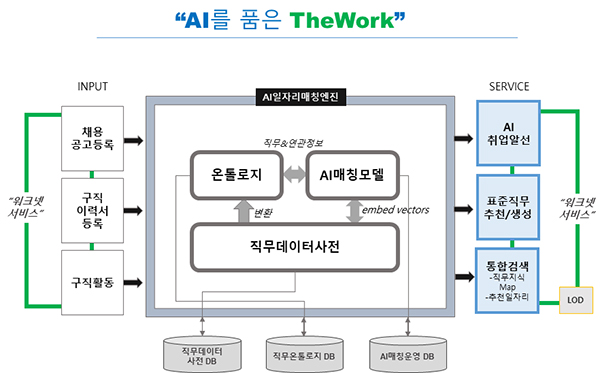 이번에 시범 운영하는 인공지능 일자리연결 서비스(이하 ‘더워크 에이아이’)는 기존 연산방식에 인공지능 기술을 도입해 일자리를 찾는 사람들에게 더 적합한 일자리를 추천하고, 기업에서는 직무에 적합한 인재를 더 쉽고 빠르게 찾을 수 있도록 했다.
