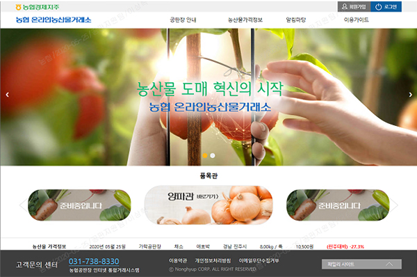 온라인농산물거래소 메인화면.대량으로 거래되는 농산물 도매유통에도 온라인 거래방식을 도입하는 것으로 중간 유통비용을 줄이고 물량 집중 현상을 완화해 가격 급등락을 줄이기 위한 조치다.