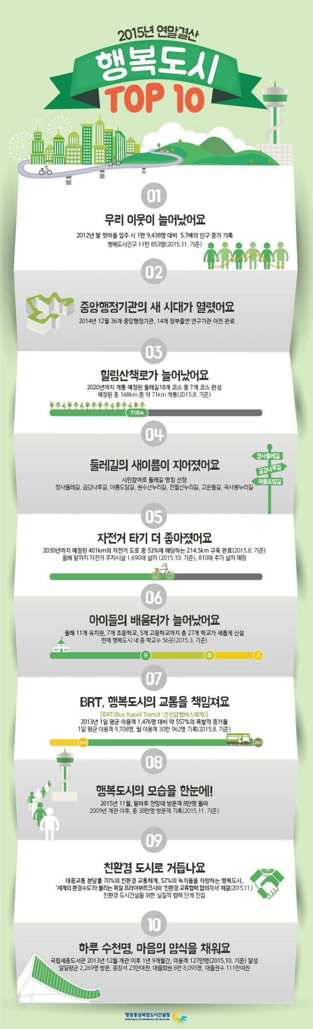 놀라운 변화와 다양한 이야기를 담고 있는 행복도시의 2015년 주요 성과를 인포그래픽을 통해 자세히 알아보겠습니다.