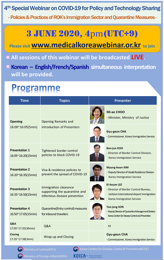 이번 4차 웹세미나는 출입국관리 및 검역 분야의 대응경험을 주제로 법무부 총괄 아래 질병관리본부, 외교부, 한국국제협력단(KOICA) 등 관계부처가 참여한다.