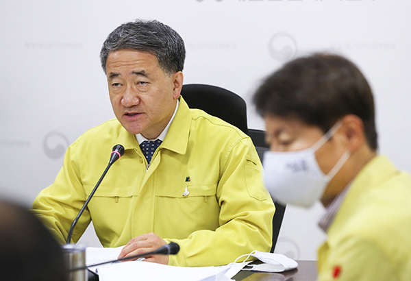박능후 중앙재난안전대책본부 1차장(보건복지부 장관)이 중앙재난안전대책본부 회의를 주재하며 발언하고 있다. (사진=보건복지부 제공)박 1차장은 “오늘부터 수도권에 대한 강화된 방역 조치를 연장한다”면서 “방역당국은 가용한 모든 자원을 활용하여 수도권 집단 감염 확산을 막고 있다”고 설명했다.
