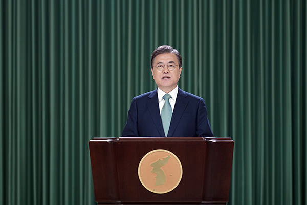 문재인 대통령이 15일 청와대에서 ‘6·15 남북공동선언’ 20주년 기념식 축사를 영상을 통해 전하고 있다. (사진=청와대)문 대통령은 “오늘 역사적인 선언을 기념하는 기쁜 자리에서 그 선언의 위대한 성과를 되짚어보고 평화의 한반도를 향해 우리가 얼마나 전진했는지 말씀드려야 하는데, 최근의 상황이 그렇지 못해 안타깝고 송구스럽다”고 언급했다.
