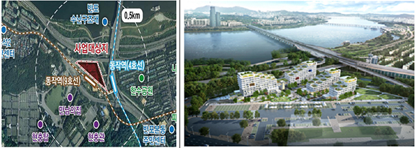 동작 주차공원 위치도 및 조감도.국공유지를 활용한 주택 개발 사업 중 성동구치소(1300호)와 동작주차공원(500호) 사업은 연내 사업승인을 거쳐 내년에 착공할 예정이다.