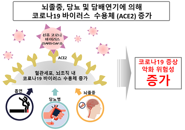 이에 국립보건연구원 고영호 박사팀은 코로나19로 인한 중증 질환 위험 요인인 뇌졸중, 담배연기 및 당뇨에 노출된 혈관 및 뇌 성상세포와 뇌 조직에서 나타난 변화를 분석한 결과 코로나19 바이러스 수용체 역할을 하는 ACE2 발현이 증가하는 것을 확인했다.