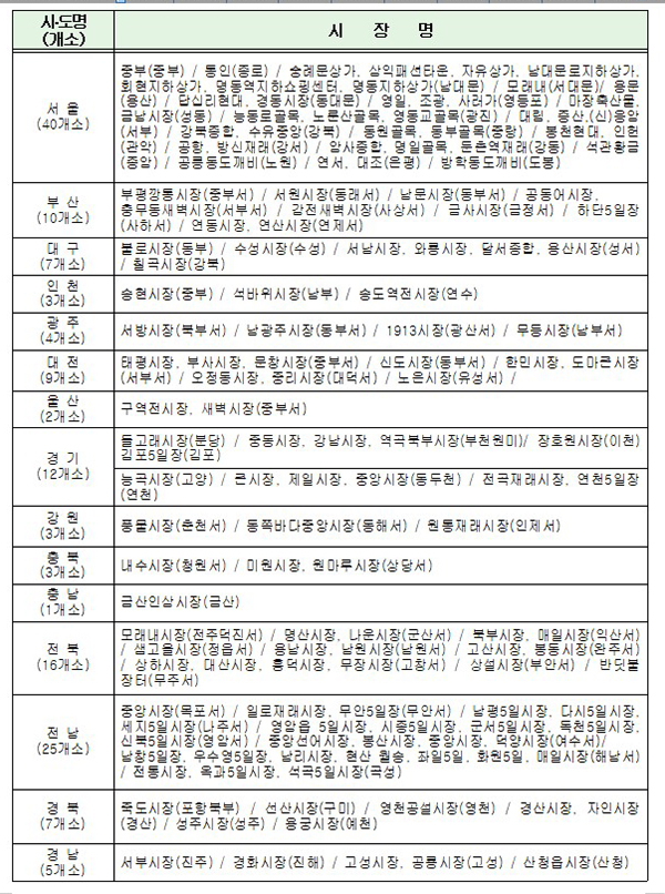 상시(연중) 주차허용 전통시장 현황(147개소)고규창 행정안전부 지방재정경제실장은 “소비가 살아나야 지역경제가 살아날 수 있다”며 “코로나19로 인한 어려움을 더욱 크게 느끼고 있는 우리 이웃을 응원하는 마음으로 전통시장도 많이 이용해 주시기 바란다”고 당부했다.